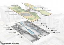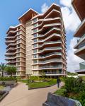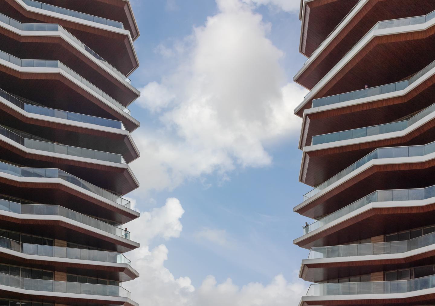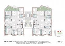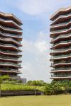 Planned in three different sizes these apartments of 8000, 9000 & 10,000 sq ft are configured with large living spaces, 5 bedrooms, a study & a gym in them.Located on a plot of 29600 sqm in Surat city, India with a height limitation of 40 metres, the buildings are laid out along the site perimeter creating a large focal garden of 13000 sqm.All the vehicular movement is restricted to the perimeter along with a basement car park generating 80% of the plot as vehicle free space.The large landscaped area rises in angular planes revealing a partially sub terranean recreational club with entertainment & sports facilities that is sheltered from heat gain & simultaneously open to natural ventilation & light.