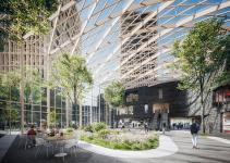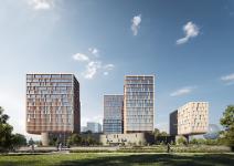 The materialization of the complex plays an essential role. The façade of the podium is finished with a locally-sourced dark natural stone and is designed as a continuation of the pavement itself – to visually minimize its height and create a more human-relatable scale. The towers are finished with wooden shading elements on top of a glass façade to reduce overheating and create a more human-friendly and calming atmosphere. These steps are used to reduce the levels of anxiety and stress common in business districts.