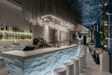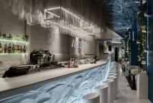 The WATER bar epitomizes a large rock on the sand. The necessary shape of the stone was created by designers from plaster, the man-made composition of the bar occupies the central place in the room. The walls are lined with claydite-concrete blocks, more grainy in texture. The word "bar" is wrote on them by the artist, as if it was done with a finger on the sand. The white сolour is predominant and no bright colors are used — only one wall is painted in the dark water shade to enhance the feeling of underwater. The ceilings are made of crumpled mesh to create the effect of ripples on the water surface, as if you are looking at it from the deep. The restaurant entrance is shielded with a waterfall, and the bar interior is perfectly visible from the embankment thanks to the panoramic windows.