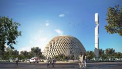 Traffic control center, in Farahabad park is placed in Isfahan southwest. This building follows site topography and is the final point for bent lines in the park. Therefore, we tried to design this building in the way that makes 360 degrees view for us this building is on the Zagros hillside, and like the eye of the city that verge to the whole site that emphasizes skyline and cyan domes. Unique shape of this building came from old history of Isfahan in Iran that is help us to keep our identity in contemporary building in new era. Structure of this building derived from structural dome Submerged in the soil like a YAKHCHAL,With its shell inspired from Sheikh Lotfollah mosque transformed to a climate plan that has its own identity and while follows its context, it is an index building that can be a symbol for Isfahan.