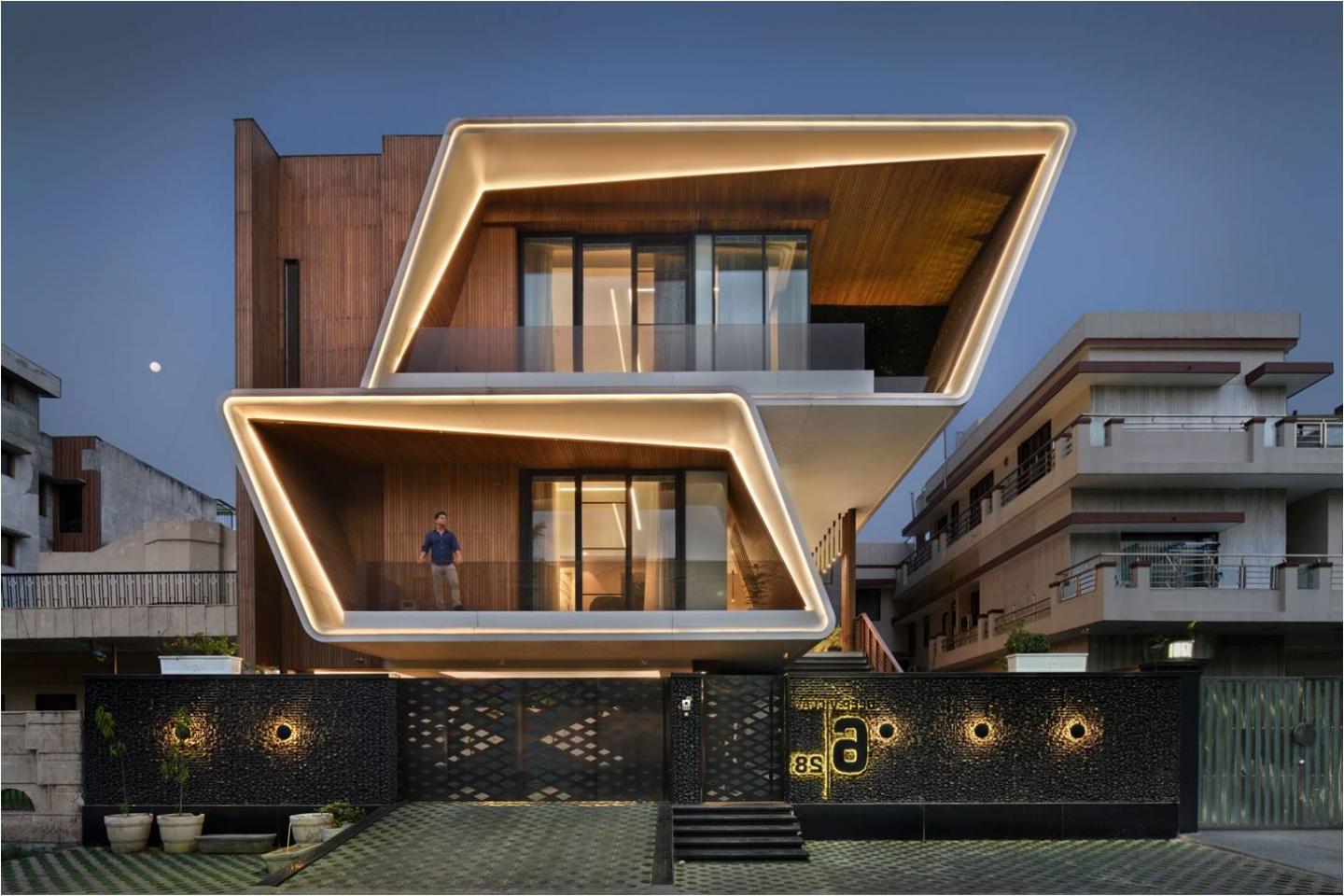 Furthermore, the form of the building is enhanced with the use of planned lighting on the facade.Standing in the dense urban suburb of Delhi, Deep Villa is an architectural landmark on its own.