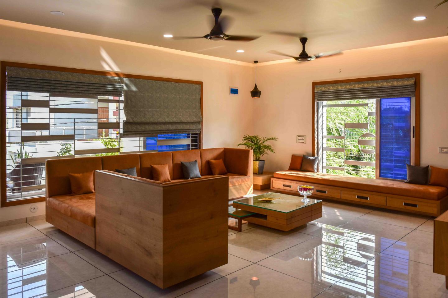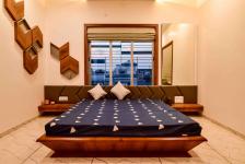 The house showcases the lifestyle of one big family following the cultural beliefs of India. Sacred Space is the first view as we enter the house. Dark wooden theme has been introduced to highlight the power of that space, by decreasing vertical dimension too.enhancing the breathing spaces, cultivating the series of events.As the plan provides the transformation spaces and visual connection throughout the house, once concern was there about privacy of kitchen. The sliding jali here answers to that question adding one traditional element for the temple itself. To widen or define the temple space in case of large gathering, sliding jali does the job, being a partial barrier between living and kitchen space. timelessness comes through minimal and ENGAGING FURNITURE Details such as floating bed, color scheme and bringing basic shapes into art forms.Material palate has been constant throughout the work, except spaces with higher values of beingness, ensuring threat this modest and sober home is everything but standard.