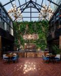 A rustic wooden door marks an entrance to the indoor level. Upon entering the devised interior setup, an individual is welcomed by a pleasant sight of persuasive vibrant interiors. A triple-height central courtyard, with a glass roof and huge antique chandeliers suspended from the ceiling, shower an ambient light atmosphere to this domain. Keeping the furniture setup key, this area constitutes a long community table made of driftwood and a casual seating positioned on the left of the courtyard. A row of classic sofas with plush green velvet upholstery, framed by cast-iron columns enclosed with curtains and railing to separate the levels formulates the schema of this extent.
