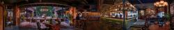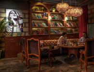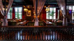 The centrally located bar serving as the focal facet may be deemed as a masterpiece in itself. A cast-iron railing is forged against the tiled bar front, conferring on a vintage mien. The bar backdrop is enhanced by the use of supplementary installations of foliage and pendant lights screened inside a cast-iron cage. The ceiling as well is framed with a cast-iron jaali flanked by four intricately detailed columns. An assortment of wooden counters and simple yet lavish furniture configurations engrosses the patrons with variance. The dining area right next to the bar is marked by a level difference on the floor which gives a sense of seclusion. The lounge-style furniture with patterned carpet on the floor and wooden ornate bookcase at the back illustrate the look of a formal living room. The wall adds to the overall look of this old stone masonry building.