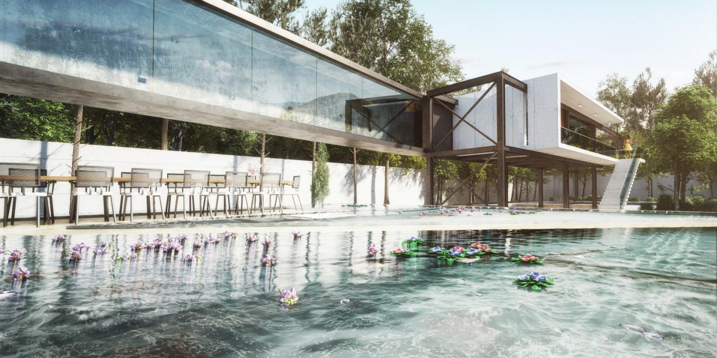 The project’s main challenge was to prevent any interference to the garden environment and creating adaptability to the existing site.The design response is: creating various perspectives through the garden such as lotus pond (utilizing an element from the garden character), bridges (human suspension on a transparent path in the garden) and circulation paths in between the garden spaces (Human movement between open and semi open garden spaces). All these features occur without moving or eliminating any existing condition such as trees.Creating seating areas with various qualities(sitting on water, sitting in the ground, under the water, under the sky and beside the tress) was the effort made to eliminate the borders between human and nature and interconnection of inside and outside.