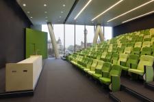 The homes along Koningin Fabiolalaan look out on a more modest building, whereas the tower is taller and appears slimmer. The impression of a slim tower is reinforced by dividing the tower into two staggered volumes. The auditorium, made visible in a cantilevered facade and in the large windows, emphasizes the arm’s public character.