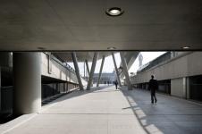 The international design contest for the centre posed several stringent parameters. The master plan prescribes a two-section building consisting of an office tower along the railway embankment and a lower, more public arm along Koningin Fabiolalaan, which includes an exhibition hall, an auditorium, a multipurpose venue, and a childcare facility. The L-shaped floor plan delineates a plaza beneath. This transfer point is a busy public transport hub with a tangle of tram tracks, bus stops, and bicycle parking facilities.