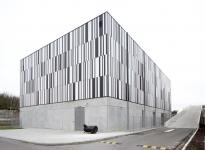 The new server facility lies beside the office building, set back from the street. The facade panels, which have to be closed, follow a random ‘binary’ pattern of black-and-white lines. The autonomous, abstract, near-iconic object is a counterweight to the ‘modest presence’. It is the very embodiment of the Telenet soul.