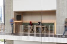The atrium, with robustly spaced doorways and a roof lantern, is the building’s backbone and nerve centre. It provides access to the office floors and the car parks, and connects the existing office buildings. The atrium serves as a circulation area, foyer and conference room, and forms the vestibule to the offices. Its stairs, landings and hidden sitting areas facilitate informal contacts, chance encounters, brainstorming sessions and consultations.