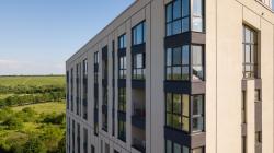 One of the main aspects of the concept of residential complex "Spectrum" was to create a high-quality community, with the interest to spend time together with neighbors. The main idea is an open urban block from detached 7 - 9 story buildings with pedestrian yards closed from cars. In the courtyard between the islands with the landscape located pedestrian paths that also serve as a bicycle path. The peculiarity of the building plot was ground level difference of 5-6 meters. We used this terrain feature to create private, fenced terraces on the ground floors, hidden from people passing by. The sloping roof with a diagonal ridge creates an unusual silhouette, forms the area’s signature and makes the quarter unique. Some apartments on the upper floors are split-level, others with a mezzanine that creates interesting and unusual living spaces.