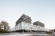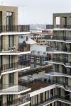 Cadiz has two faces. From close by, at the street level, one can only see the plinth of the building facade with its stores and offices. A trellis on the second and third floor encircles the entire building block, screening the apartments from the street. From the street, you can catch a glimpse of the communal inner garden. The entrances to the residential units are located here. From a distance, Cadiz offers a more monumental impression. Four towers are set further back from the building line, kneeling on the roof of the base with their feet in the garden of the inner courtyard, situated on a lower level. A sloping green surface connects the communal interior area with the private gardens on the base, from which the occupants enjoy distant vistas of the port and the city.