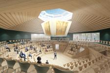 The building is structured in three levels: the groundfloor will be transparent and will invite people enter the building. The groundfloor will be ocatgonal and the auditorium will be in the centre and will be the first space people will see when they enter the foyer.