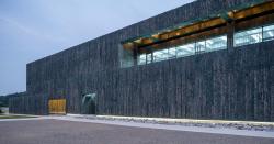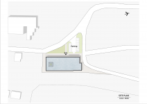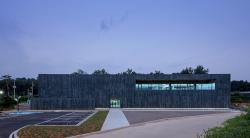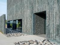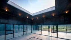 The exterior wall of this simple form of the building is the main transitional element to reflect nature and to house the function of this man-made architecture. For this transition, different textures and the degree of roughness are used and positioned sequentially from outside to inside. Especially, the rough and natural treatment of the exterior wall is composed of organic material with inorganic concrete to perceive reminiscence of nature. The medium textured and chiseled surface of the concrete wall is designed for the inside transitional area, such as the space between the first and second-floor area and the entranceway. The fine smooth blue-dyed concrete is exposed for all interior space to interact with the natural and artificial lighting.
