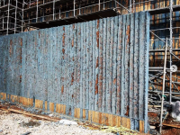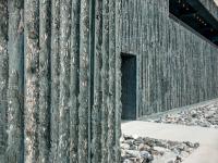 The distinctiveness of the façade design and method of construction was studied, investigated, and tested. This textured exterior wall is composed of three layers: 150-mm insulation is laminated and sandwiched in between 200-mm reinforced dyed-concrete and 280-mm exterior façade casted-concrete. The outer layer of concrete is cast by reusing local pinewood, and the bark was left embedded in the concrete surface for the texture. All of the concrete used was dyed with cobalt-blue pigment to make sure the color dissipates over time. This textured exterior wall was designed to perceive the different ambiance of the daylight to create unique shadows to be projected so that people can observe and experience the time changes of the day. After the sun sets and there’s complete darkness, the light-revealing designed at the bottom edge of the wall (at ground level) illuminates and reflects the wall texture.