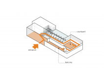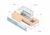 Layout and integration of different scale and function of space within this building are positioned to visually communicate among each program; Glass enveloped double-story height brewery is surrounded three-dimensionally by beer tasting area/pub, exhibition space and office. The brewery plants/manufacturing space with their supporting area and ground floor beer tasting pub are located on the first floor. And the new exhibition space is on the second floor to promote the new beer brand. Also, on the second-floor programs include observing deck, beer tasting area, kitchen, offices, and an open-air courtyard. Exhibiting the overall bear making process can be seen from the first and second-floor beer tasting pub area through the glassed box atrium while tasting a beer. 2nd-floor beer tasting area/pub is located in-between and adjacent to the brewery, the balcony, and the open-air courtyard; therefore, people can eat, drink, and observe at the same time. Open-air courtyard and the deep setback balcony are to please the outdoor nature, as well as to admit natural sunlight into the inner space.