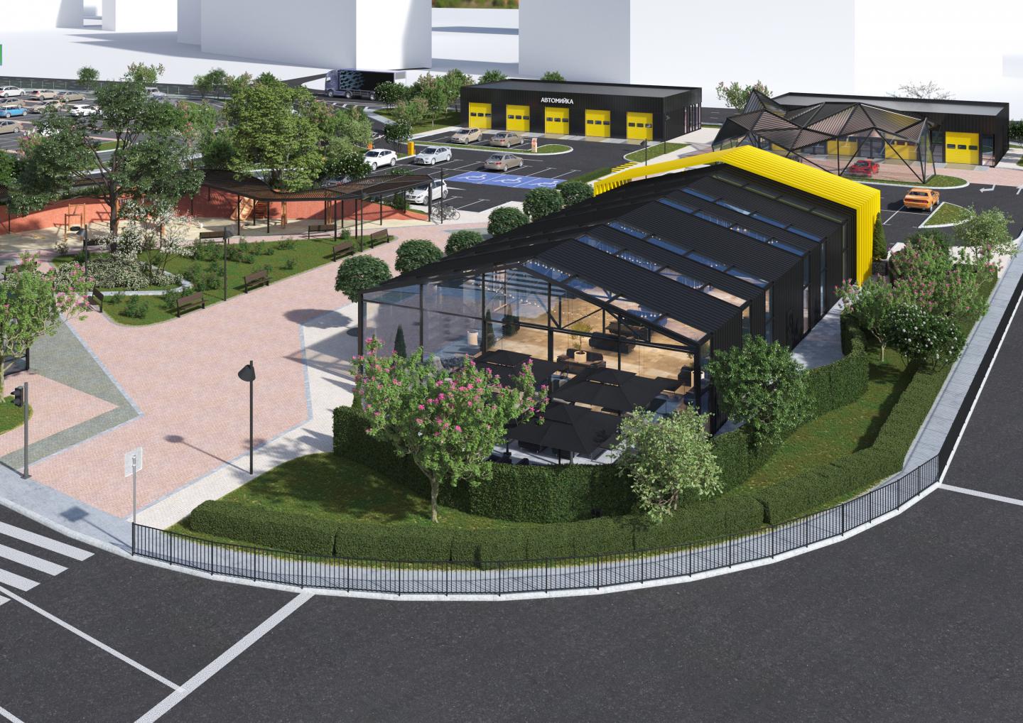 The allocated area for the project was used as a chaotic parking. The task of the architects was to create a space for general use, for leisure activities and for car maintenance. Considering that there are a lot of high-rise residential buildings in the district and problems with parking spaces, we decided not to clean the parking. Were thought out a new ennobled parking spaces with the security of territory and installed electric stations for electric cars. On the rest of the territory located a restaurant and nearby to it a large recreation area with a playground, a deteyling center and a car wash.