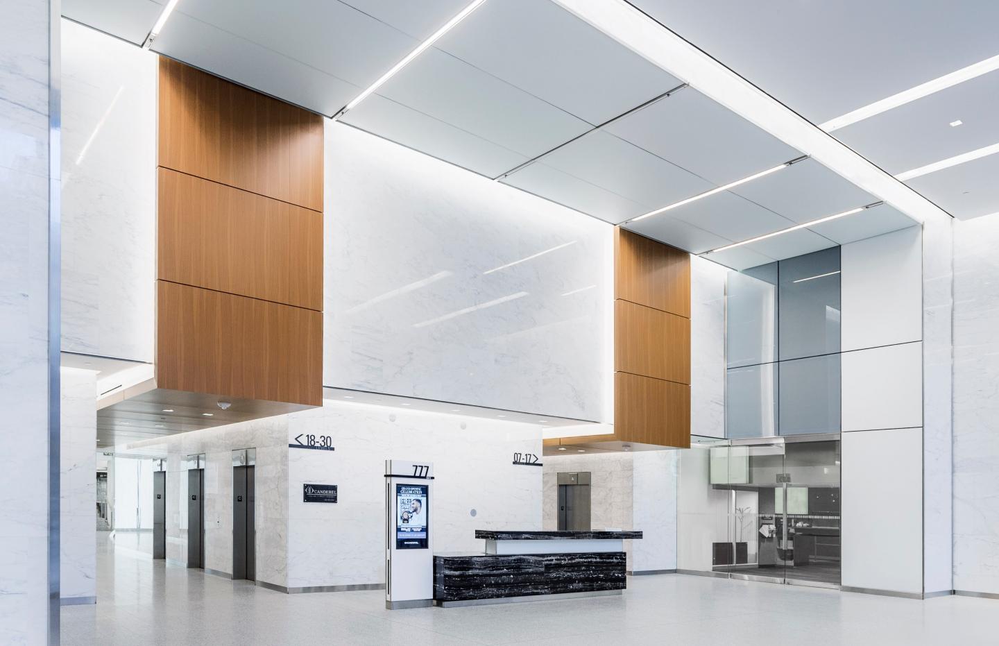 By unifying different elements through a seamless materials pallet while creating a unique and ageless spatial character through layering of surfaces and textures a sense of continuity between dispersed elements is experienced; the main lobby features a grand glass frame layered over Carrera Marble walls that greets the users as they approach the space and make their way to the elevator lobby. Wood panels floating over the wall fold into the elevator lobby ceiling to reflect directionality and provide a warm accent for this transitional space.