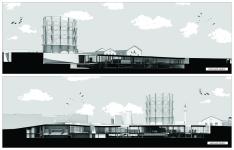 Two existing buildings are kept as they are for people to experience them. Glass platforms are added to the parts of the building which are not accessible. Gasometer is also kept as it is and opened to the public as an observation platform. The part below the gasometer is turned into a nightclub.