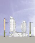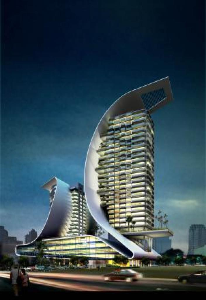 the two towers of hotel and office are each articulated distinctly and separately and yet joined with a masif free form curved blade created a volume at the base as a podium {retail and hotel services}. the office externally articulated facade of horizontal fins protect it from sun glare of the harsh climate.the hotel has a recessed, the intention is to provide