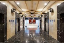 The elevator lobby was anglicized thru the use of barn like timber trusses and Victorian lights.
