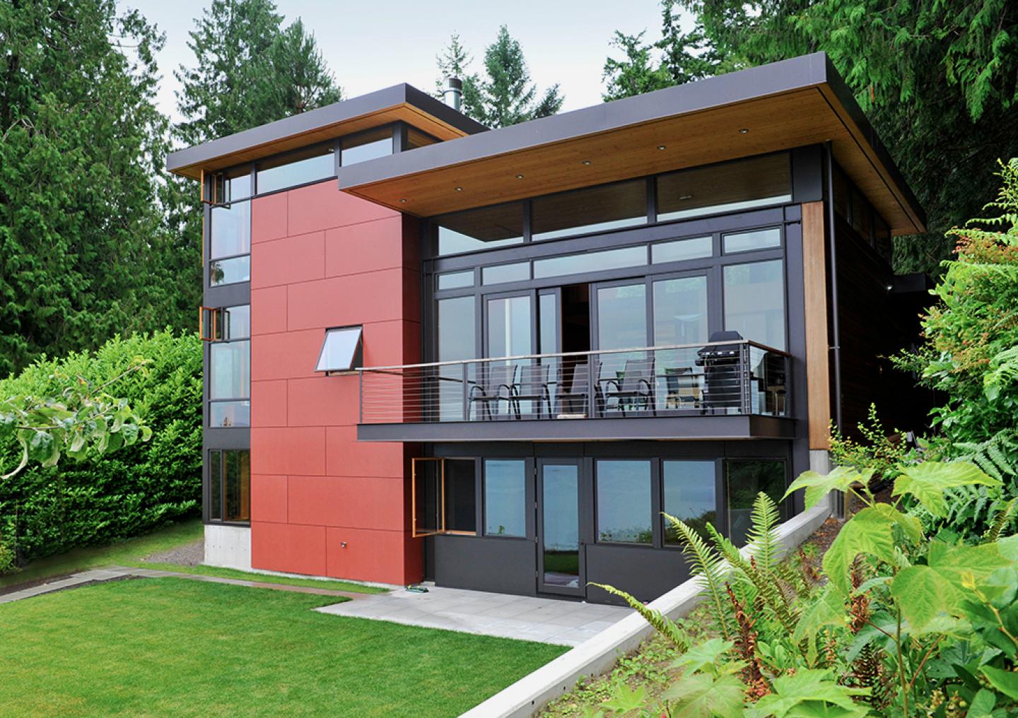 In form, the house is a combination of a red vertical volume and a horizontal wood-clad volume, which come together on either side of the entry. Connecting these two masses is the fully-glazed, transparent living space, lending the home a feeling of lightness and openness. On the exterior, the distinctive red-fiber paneling was chosen not just for its aesthetic qualities, but its durability and low-maintenance. The panels even make an appearance on the interior of the house, wrapping around to clad the living room wall, which is fitted with a custom-fabricated steel fireplace.