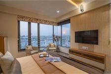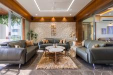 The balcony leads to a spacious drawing room which has a very airy vibe with large glazing on both sides. The highlight of the room is the white textured wall on the back of the sitting and a stone-textured MCM cladding TV wall. Texture creates a drama in the room with a bunch of brass artifacts, creating an essence of the cozy ambiance of the room. The Italian leather material and color of the sofa furniture add luxury and comfort to space.