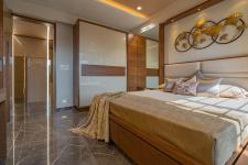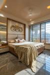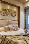 The master bedroom exudes its own style and young personality. The wall paneling behind the bed is reflected from the ceiling. This backdrop from the ceiling to the wall gives a minimalistic ambiance. Back-painted white glass with wooden touch in wardrobe and TV unit reflects the overall charisma of the room.
