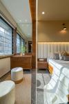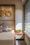 Guest Bedroom is rendered with an off-white color scheme with wooden highlights, inviting the east light, creating the room bright and young. A simple wooden framed niche behind the bed makes the bedroom simply elegant that presents a striking statement with golden accents.