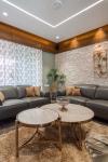 Soothing neutral tones for the couches with a white marble finish center table have been incorporated in the living room with complimenting shades of curtains.