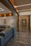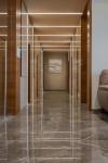 The interiors follow a subtle color scheme, highlighting the luxurious grey Italian marble flooring, rich materials, and exquisite décor details. Unexpected touches like the exaggerated lights, brass artifacts, accents, and illusive pattern in the passage add surprise elements.