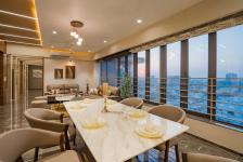The Dining top is gorgeous artificial white marble that adds up luxury to space. A small corner is treated as a puja area with a holistic and divine wooden partition.