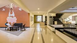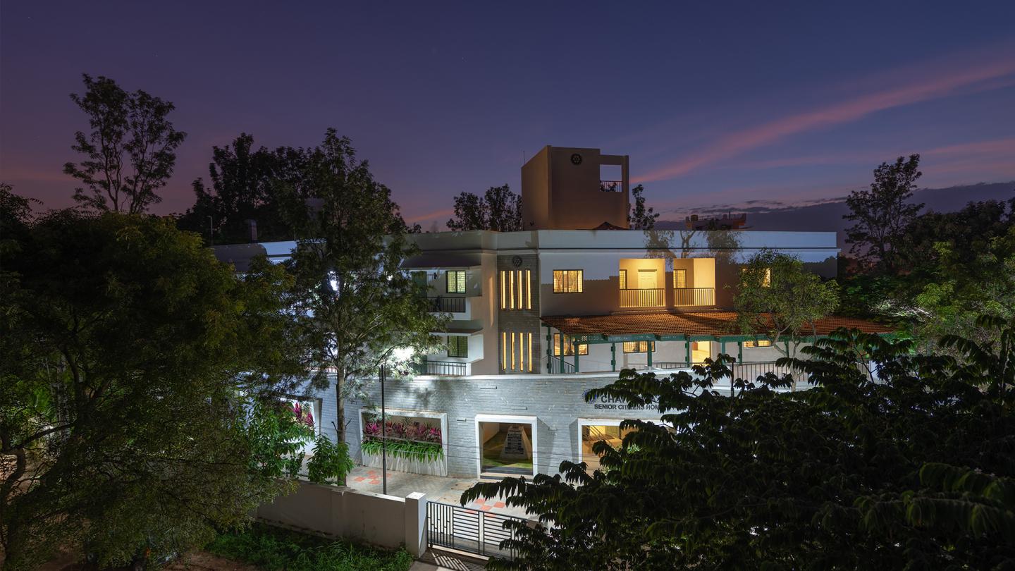 The design language is largely minimal in terms of the colours and material palette creating a peaceful and calm environment. Landscaping around the building with fully-fledged grown trees, aromatic plants and kitchen garden helped in creating a serene setting. Water from the Sewage treatment plant is used in landscaping, reducing the dependency on fresh water. Locally sourced entry stone façade wall was conceptualised to symbolize stability and security. By harnessing natural light though skylights, solar panels, wide corridors with ample tight and ventilations, the load on artificial systems has been reduced to a large extent, symbiotically lends a pronounced character to the building and assists the senior citizens to adapt to the habitat with a sense of feeling of reverence, making the building sustainable.