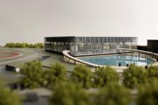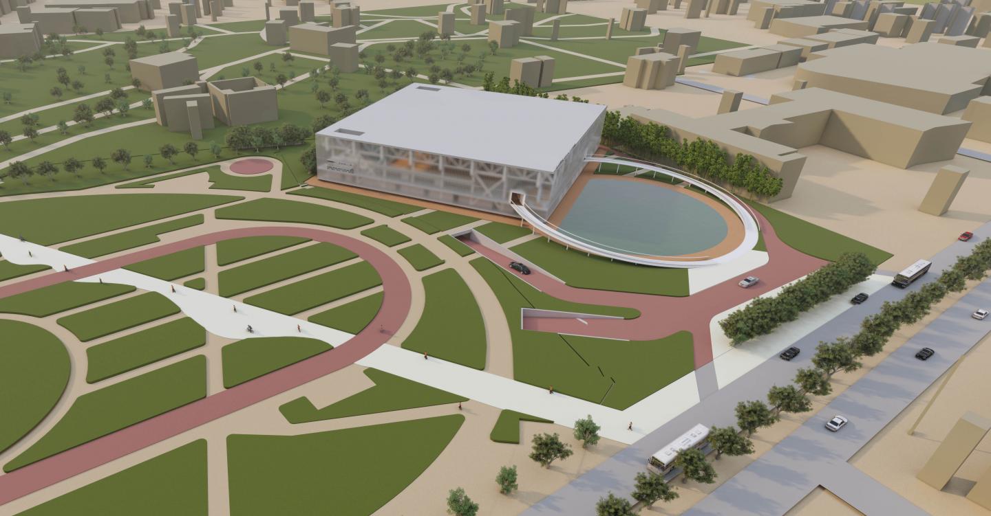 Players and staff buses will be parked at the north side of the building. For the visitors by car, from the east of the parking garage, three elevators will go to the pond and the drop off area.
