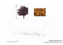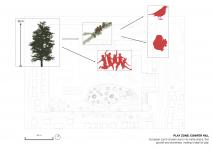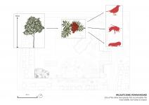 The previously tarmac-covered schoolyard was converted into a new green space. Three planting zones make up this new school park, each based on their intended usage and characteristics. A small hill of rowan to the Southeast provide shelter and a food source for local birds, squirrels and insects. The central zone is planted with European larch, a native and fast-growing species suitable for climbing and play. Finally, the revamped pedestrian path hosts a blend of common and copper beech, a deciduous which changes colour with the seasons and creates a pleasing walk for the neighbourhood.