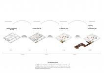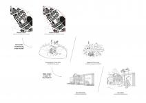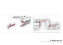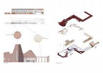 Stage 2 conceptualised an extension to the school which could be alternated between school and public uses. A previously under-used corner of the schoolyard was chosen as the site for the new wing. Two glass-clad arcades connect the old wings to the new. Glulam arches of varying widths create an internal funnel into the new space while simultaneously allowing pedestrians to look into the schoolyard. The S-shaped plan outlined two new courtyards: the internal one serving as a new school garden; and the external one forming a new public corner/plaza. The location of the project not only established a new public front for the school but also functioned as a new junction between the Eastern and Western halves of the neighbourhood - thus placing the primary school at the centre of the renewed urban plan. Internally, the glass arcades and movable room dividers ensure a high degree of flexibility, allowing the school to choose how much of their new wing they wish to open. The end result is a highly adaptable space which merges civic and educational functions. During school days, the new wing can function as a semi-detached social space for the school: where recess gathering, teacher's breaks, culinary classes and after-school care take place. During after-school hours, the doors in the glass arcades can be shut, severing the connection to the main school building. The arcade adjacent to the plaza can be opened, connecting the street to the new school park, and transforming the wing into a full-fledged community centre.