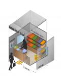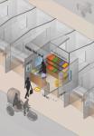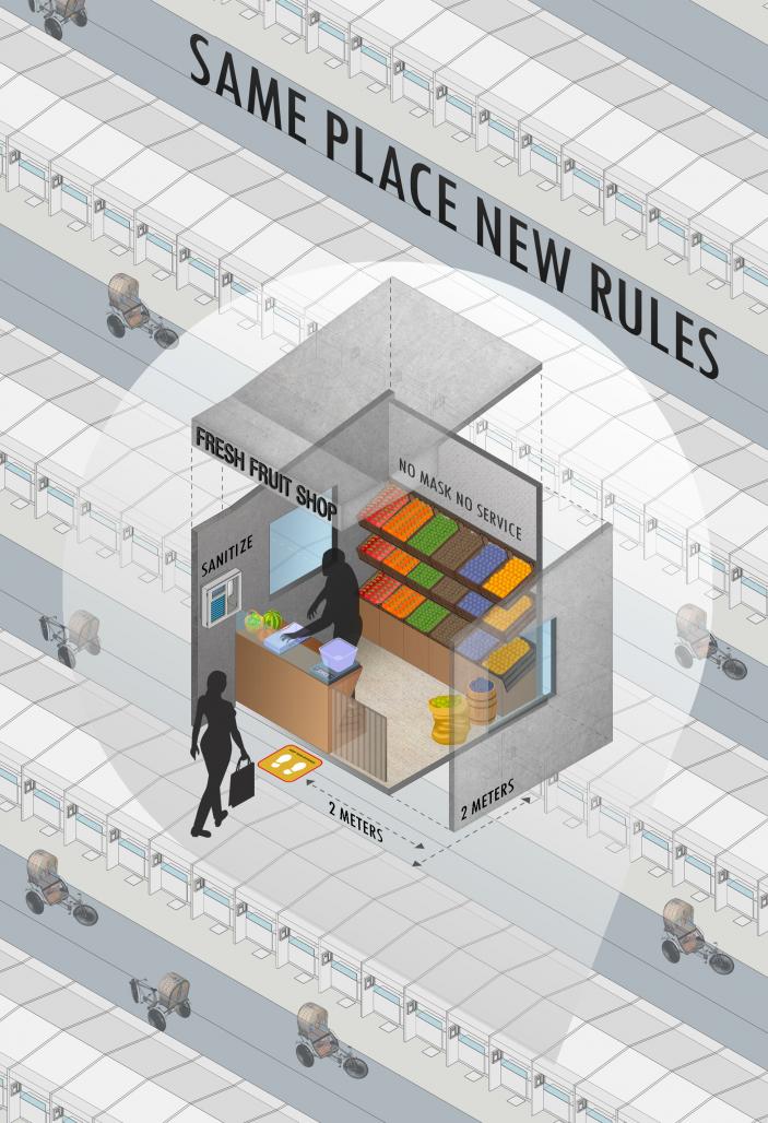 Through my shop design, I am portraying the essence of a nation where people are poor. As we are approaching winter in Pakistan, we have already begun facing the second wave of the Novel Coronavirus. The Pakistani Government has adopted ‘No mask no service’ policy. New rules or the new normal should be mandatory in the open air markets called, ‘bazar’. These markets are indispensable trading venues for local people and have a cultural significance. Apart from this, these open air markets are a source of livelihood for many street vendors who are at high risk of contracting the deadly disease. Since these street vendors have very low wages, it is very difficult for them to afford treatment. Through art and design, I am trying to portray the necessary steps that need to be taken to prevent theseneedy people from catching the disease. As it is seen there is no roof abovetheir heads and they often suffer from heat stroke (during summers). Most ofthese people have very little or no education and so I thought of conveying a precautionmessage without using much text in design.I have created a compact andorganized version of the same space with ample storage and new rules for the same place.Proper use of vertical space to allow more goods and a little space for them torest. The fixed glass is for visual connection with neighboring vendors withoutcontacting physically. At first the customers will sanitize their hands beforeaccepting goods from vendor or paying money for goods. Each shop has UV scannerfor disinfecting goods. Distance of 2 meters is maintained between eachcustomer. The phrase ‘no mask noservice’ indicates that customer will have to wear a mask at all times.