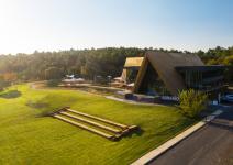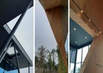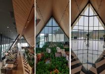 Whilst triangler main façade which is facing to road side, defines the entrance through monumental stairs which sits on the large grass ground, other triangler façade this time facing to natural park & biological pond, are two start points of connection between entrance and natural park, which you can experience well framed sceneries with a dash of sun set warmth in a romantic ambiance. Wood cladding of the exterior shell is also used at interior façades, thus determines the continuity of the shell effect from both inside and out.