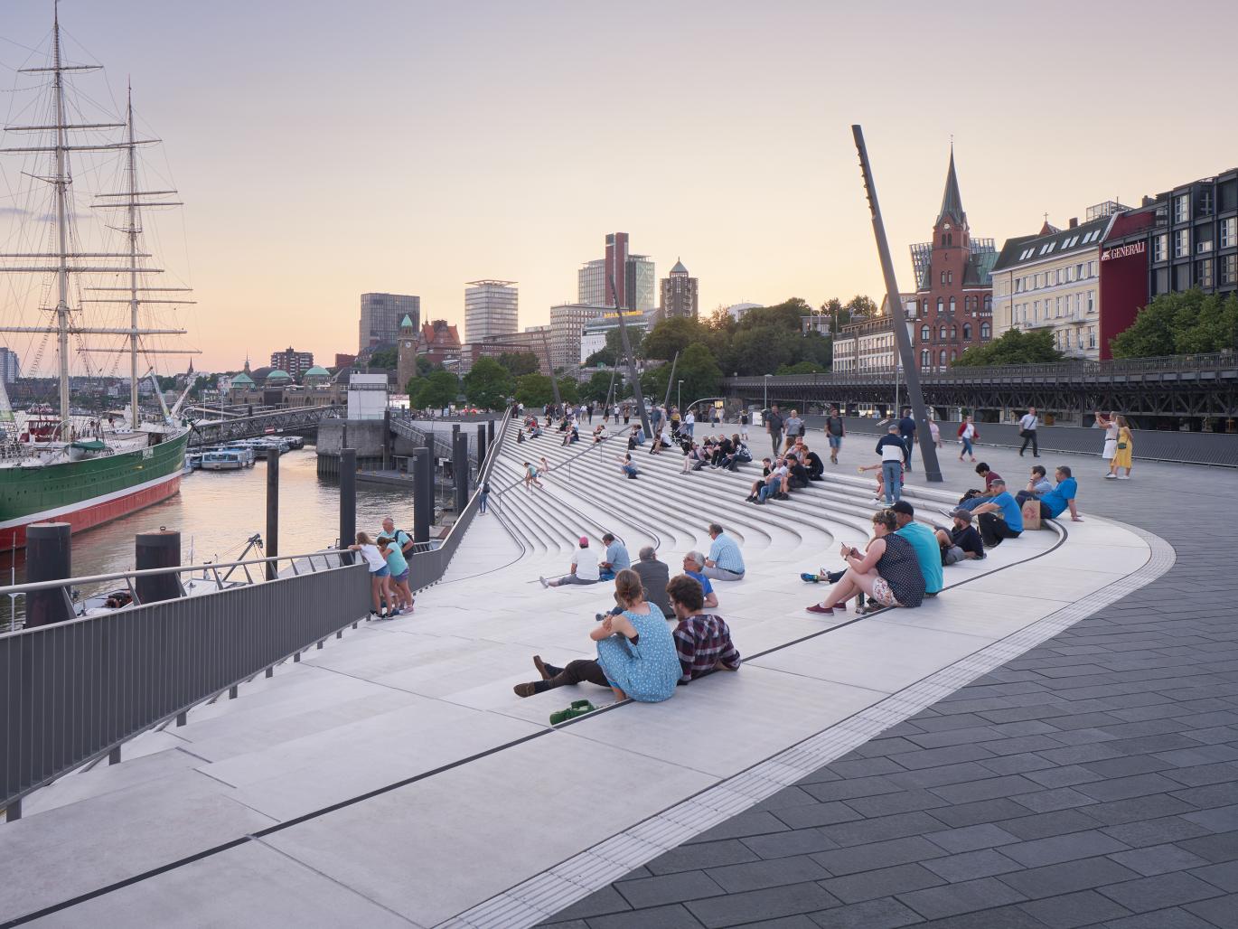 Wide staircases resembling small amphitheatres are carved within the flood protection barrier at points where streets from the adjacent neighbourhoods meet the structure; giving passers-by at street level views of the people strolling along the promenade at the top of the barrier as well as views of the masts and superstructures of ships in the Elbe.