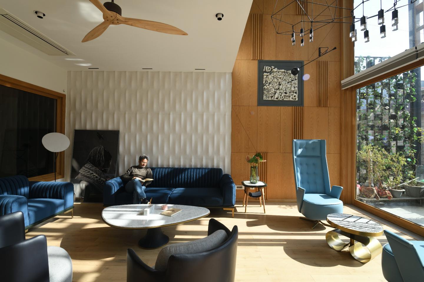 The house has been divided into three zones where the ground and first houses the private rooms, the second floor is a semi-private area with a connected terrace and the third floor consists of a terrace for recreational purposes.