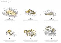 The form-finding process of the overlapped campus followed these steps: 1) occupy the largest site area that fulfills both solar and setback regulations; 2) place the running track on the roof, forming a 14m-deep ring structure; 3) elevate the building to provide maximum accessibility to the courtyard; 4) sink the central plaza one level to provide more intimacy and noise protection for the neighbors, while the permeable ground floor still grants good conditions of sunlight and ventilation; 5) insert a series of sloped lawns and grades that extend from the sunken garden upwards to activate the whole perimeter of the ground floor.