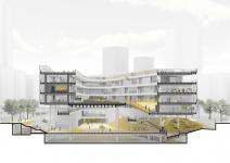 The overlapped campus is the winning proposal for the renovation of Lianhua Primary School, which stands in the middle of a dense neighborhood and is planned to quadruple its size (from FAR 0.9 to 3.5), with the added challenge of fitting a 150m running track.