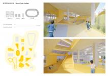 With a compact massing strategy the entire program fits in only 5 floors above ground, minimizing the vertical circulation, which is always a critical limitation for primary school design. Besides the standard cores, a more sculptural system of stairs, ramps and nets creates a direct connection between the sky track and the sunken plaza, with a strong visual presence and a series of fun embedded functional elements that help activate the internal courtyard.