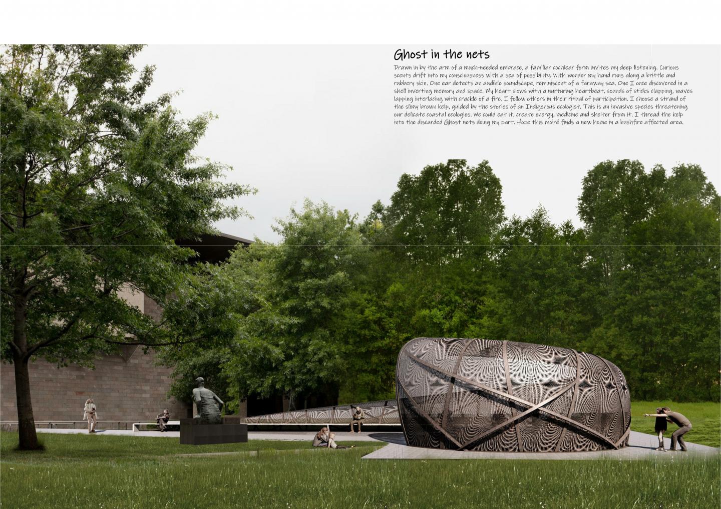 Ghosts in the net embrace the ephemeral with speculated social imaginaries. With the intention to inspire deep listening, the structure is framed by a cochlea like a form unfolding in time. Led by First Nation creative leadership, the skin of the structure transforms through a participatory denizen weaving. The textural form may be reminiscent of ancient mythological sea creatures that connect the stories of multiple cultures through time and place. The ensemble pays tribute to the temporal, enigmatic Eel trap 2019 by Boon Wurrung artist Mitch Mahoney and Mutti Mutti Wemba Wemba Maree Clarke. Our hope is to inspire similar custodian invitations to expand communities of care. Our aim is to frame metaphoric layering to decolonize, reconcile and indigenize our city with regenerative intervention. In this instance, our attention focuses on co-created sensorial landscape embedded with curious yet familiar sounds, smells, tastes and touchpoints. In particular, make tangible the barely audible connections in the liminal spaces between belonging and becoming.