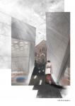 From philosophical point of view the morphology is connected to the reference mentioned above. The site is a piazza surrounded by buildings and the same concept is repeated in the new built space, in other words a micro is created in the macro system. The tiny irregular streets – ramps and stairs going through the site, following the diagonals, splits the area into four parts. These parts are the lifted corners in which are placed indoor spaces, playing the role of the buildings surrounding the square. Last but not least, the piazza is formed in the center between the indoor spaces, where the “tiny streets” cross each other and Saint Peter of Verona Monument is placed in the middle.