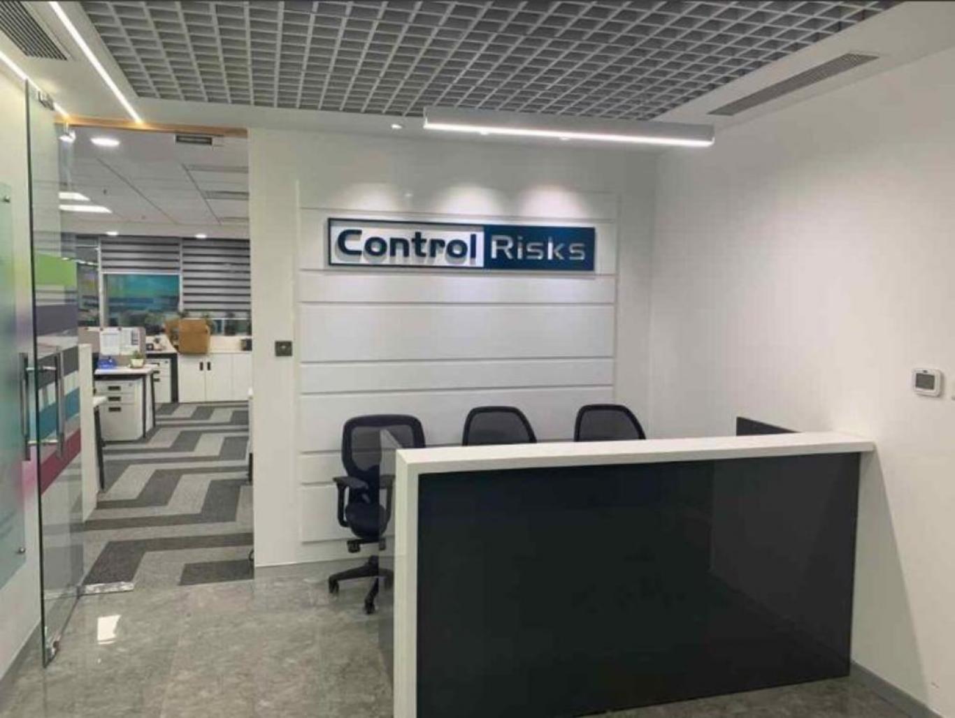Control Risks Office Interiors TYPE: Commercial Interiors LOCATION: Eros Tower, Nehru Place, New Delhi AREA: 2200 sq. ft. YEAR: 2019 The project was required to be designed and executed on the grounds of an existing branding theme and guidelines for brand identity. The quick timeline was achieved through the use of minimum materials and using super graphics for getting the desired theme.