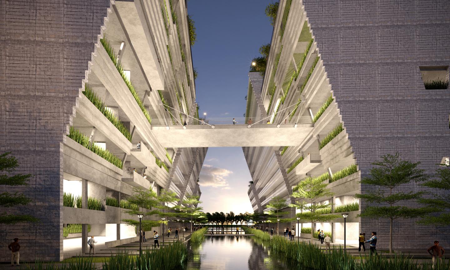 In an area with five hectares, the design mission is to create a roof of knowledge between two sides of buildings. It is not only a symbol of an invisible house on the water with the rice fields being behind but also an opening heart to receive the knowledge image, every activity is taken place under the “roof of knowledge”. The continuity of context, landscape, water surface creates the flow for the project. In terms of buildings, each block of building uses the resemblance rhythm which is harmony in general when they want to extend the school. The inspiration from the identity of An Giang is presented not only on the ground but also on the vertical surface. The development of the country has witnessed by urbanization with the appearance of a lot of modern buildings. Therefore, sustainability has emerged as a topic of interest and the purpose of creating a sustainable university is to decrease either the concretization or pressure on the environment. Landscape plays an important role in planning and architecture, it helps the users to control their feeling, protect entire the campus by green coverage.