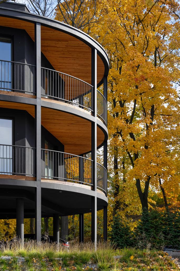 The unique context of the place and the potential negative consequence of implementing a new tissue in this unique area meant that the decision to shape a new building was not easy and had to refer directly to these guidelines, not compete with them, and "respond" to the environment with its uniqueness in a contemporary way. The task was even more difficult as the budget was limited and the investor's expectations were high. The idea and shape of the building resulted directly from the irregular polygonal shape of the area intended for development and the idea of leaving the largest possible tree stand on the plot. Such a simple inspiration has become the basic guideline for shaping the building. Creating the form step by step, first of all: the solid was formed in accordance with the function of the apartments, optimizing their function into the shape of an irregular polygon. Then, a perimeter line was marked along the plot boundaries and the block of flats was surrounded with balconies to obtain a panoramic opening to the surroundings. Due to the acute angles (foreign in the context), it was decided to round the corners, referring to the character of the interwar villas in the neighborhood, tree crowns and the surrounding greenery. In the next step, to open the view to the surroundings, the block was dressed in wooden viewing terraces with various surfaces around it, an internal break in the form was introduced by implementing a patio to illuminate the internal parts of the apartments (bathrooms and entrance areas to the apartments) and the floor of the residential part was raised by one level, leaving undeveloped ground floor as a space for social interactions of residents and additional external functions. The building formed in this way received unique features in the form of large terraces, from which you can enjoy the charms of the surroundings, and full integration with nature due to the proximity of trees and additional lighting in the patio. In the last step, the rhythm of the elevation was shaped. Vertical divisions of the façade were introduced, creating expressive regular squares arranging the freely formed volume of the building. It was ensured that the division of the facade and its rhythm were equal and did not have anomalies in the form of extensions or additional elements.