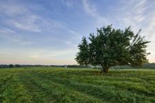 A framed view of cows on green hills where there have been cows on green hills for generations of this family owned farm. The focus of the frame is a century tree that is the ranch marker used for wayfinding throughout the hills.
