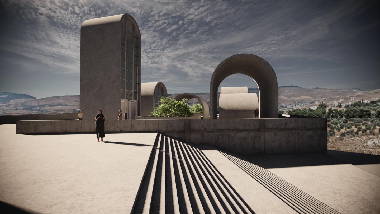 Palestinian memories transferred from "The satellite node" are put in a room that preserves memory beneath the garden of exile and beneath each arc where their walls welcome memory in galleries and cinemas. To access the beneath memory after completing the garden of exile, you must pass through a ramp surrounded by a 15m wall height, giving you the sensation of penetrating the apartheid wall.