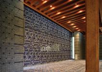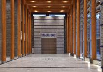 The Poplar trees are planted in the structural grid of the building. Once through the entrance portal, the strong rhythm of the stained silver birch column seen as the ‘Poplar trees’ march into the building with the flanking wall in cut stone with stained pine for roof decking and silver birch for columns, rafters and beams, lead one to the breathtaking, fully glazed grand Foyer which has the view of the Civic Plaza, river and the majestic mountains beyond. On either side of the Foyer, portals lead to the Social Hall and the Contemplation Hall. The floor pattern is embellished with the blue stone whilst the wood columns have an inlay of locally embroidered strips of fabric using local motifs, the wood columns and ceiling create warmth and a welcoming feeling. The Social Hall, with its stepped wood ceiling and engineered oak wood floor with the wedge wood inlay, has the view of the river and the park. The social hall is surrounded by glazed panels and wood verandas that provide a very strong relationship of the social functions to the park. The foyer with its tall wood columns leads to the contemplation area which is embellished with a rhythm of three stained plywood clad sky lights. The stained-glass windows on either side of the ante room bring color and light into the space, delighting the senses. The calligraphy on the feature wall is made of granite and synthetic stone pieces in relief. This space with its carved columns where precious light streams in from all sides in a culmination of a series of aesthetic experiences that remind one of the search for the Divine Light.